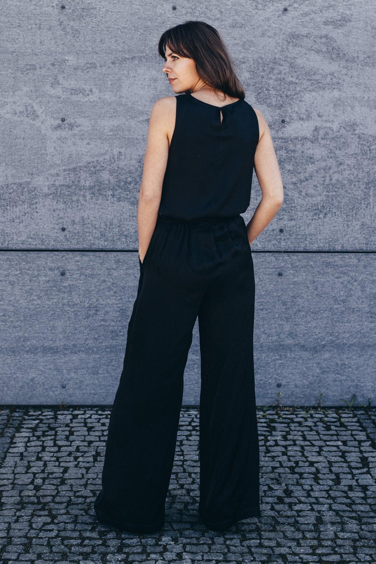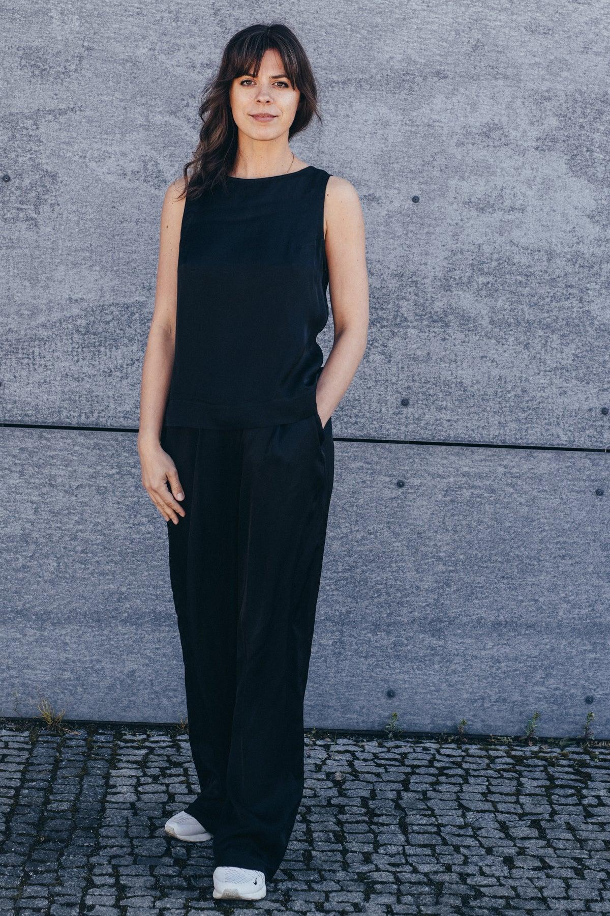 W tym topie nie chodzi o to, by błyszczeć, lecz miękko odbijać światło. Szerokie ramiączka i półokrągły dekolt blisko szyi tworzą ramę dla minimalistycznej formy. Z tyłu, niemal niewidoczna, zapinana od wewnątrz, subtelna łezka.
